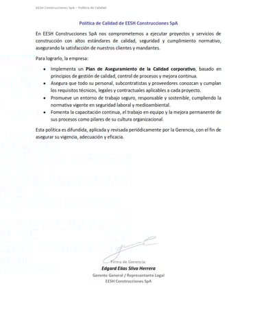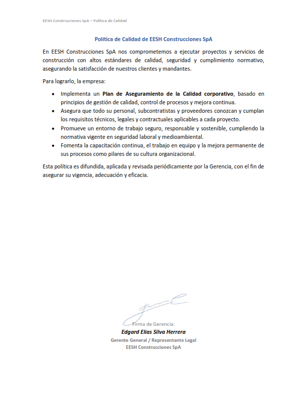 EESH Construcciones SpA declara su compromiso con la calidad, el cumplimiento normativo y la mejora continua, ejecutando sus proyectos bajo un Plan de Aseguramiento de la Calidad corporativo, orientado a satisfacer los requisitos técnicos, contractuales y las expectativas de sus clientes.